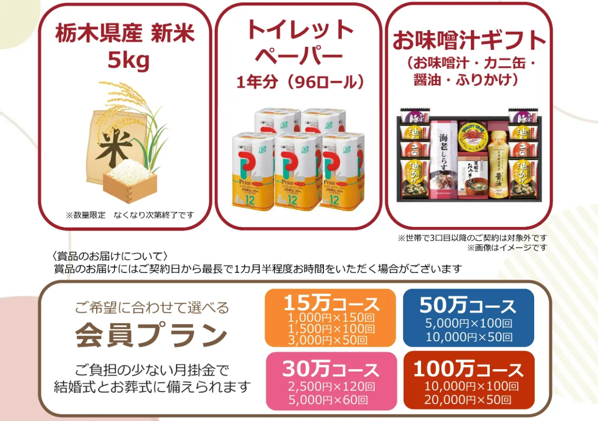 この秋、くらしの友 冠婚葬祭互助会システムに初めてご加入いただくお客様限定で、期間中にお好きな賞品3つの中から1つプレゼントいたします!