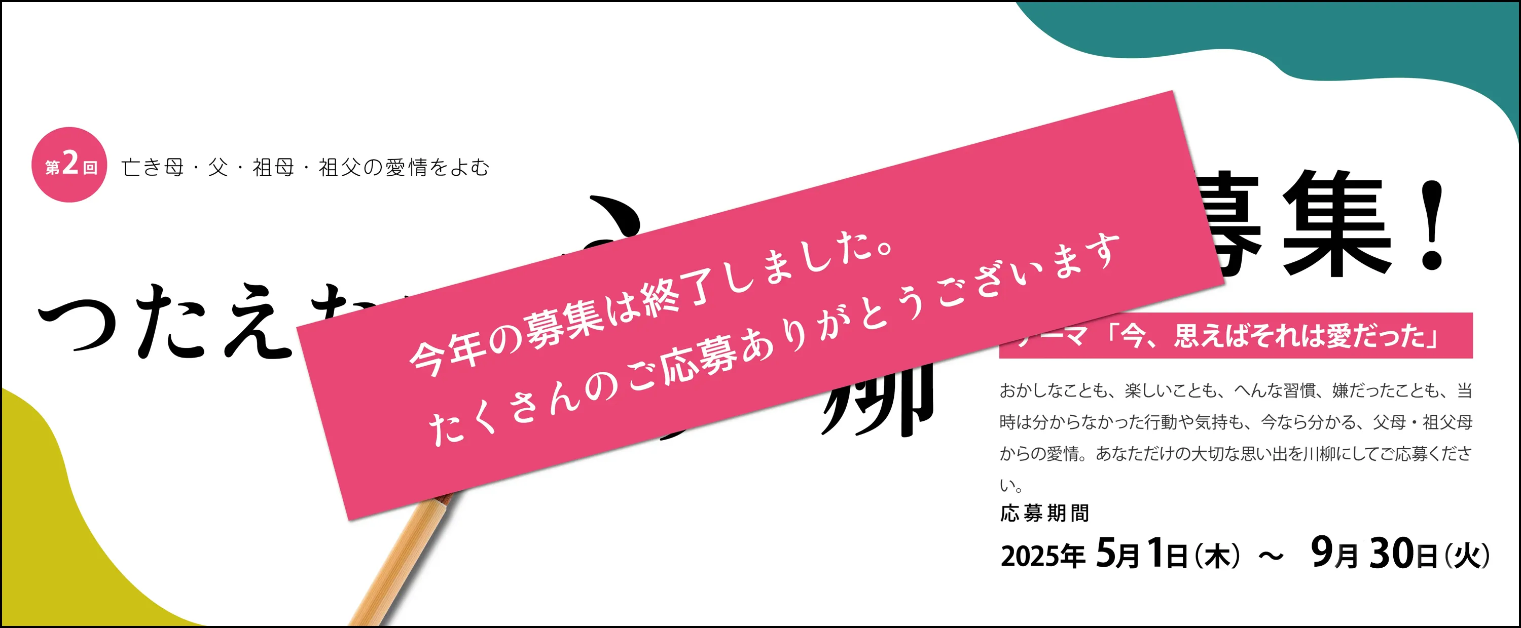 亡くなってしまった、⽗・⺟・祖⽗・祖⺟との出来事から、「今、思えば愛だったな」と、当時は分からなかったけど時間が経って気づく愛情を、川柳にして応募いただく取り組みです。「びっくりするようなこと、変な習慣、いつも⾔われていた⼝癖、嫌だったこと、じんわり温かくなったこと」など何でも良いです。この取り組みを機会に⽗・⺟・祖⽗・祖⺟と過ごした⽇々に想いを馳せ、与えてくれた愛情を⾒つけてください。