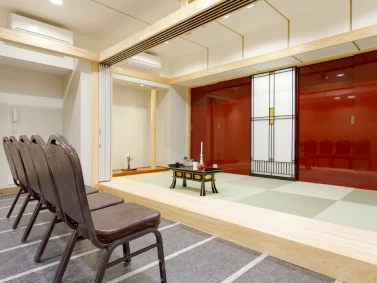 2階式場は、家族葬から一般葬まで対応可能で約60席。